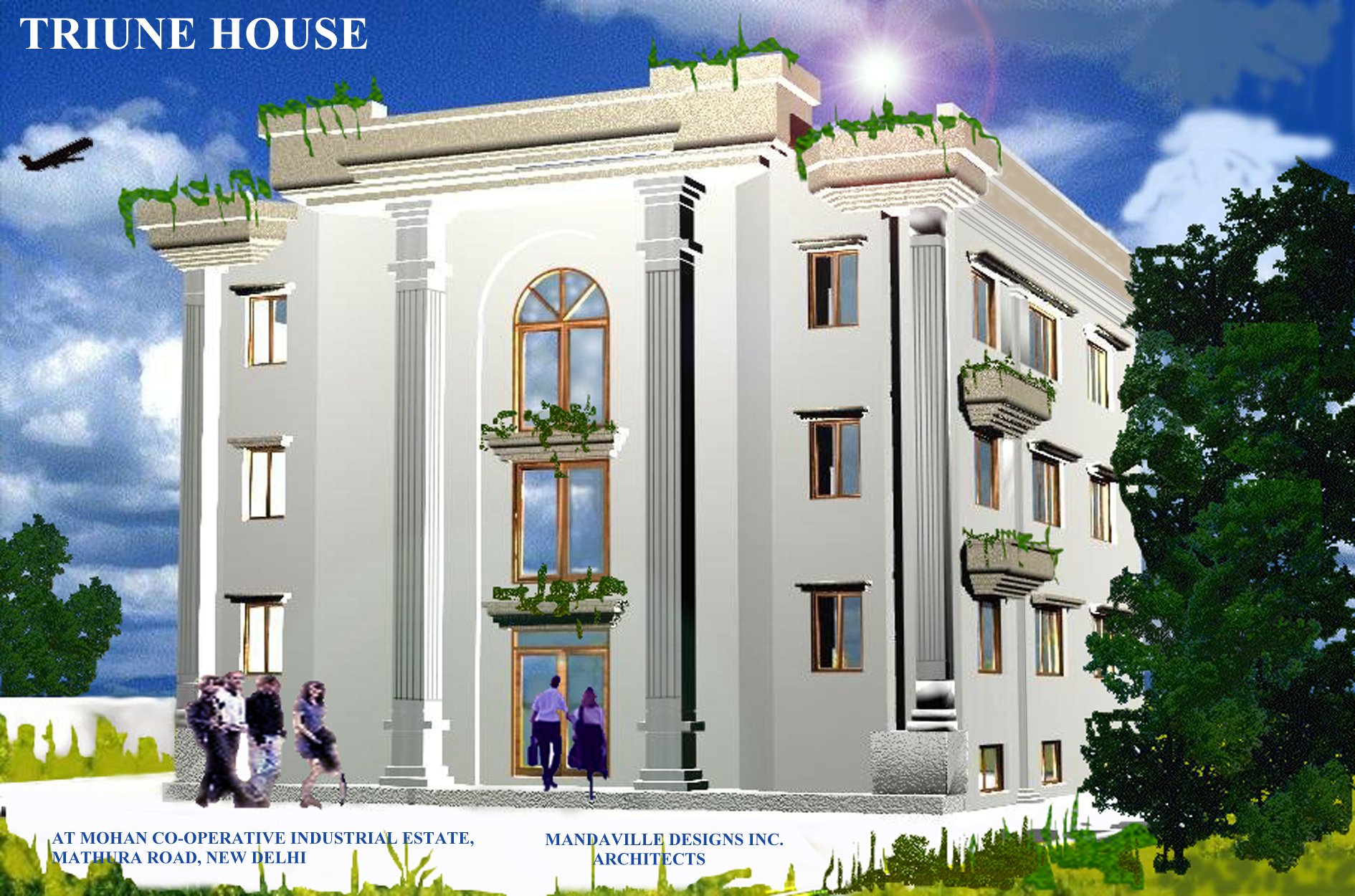 This is to certify that M/s Mandaville Designs Inc., 538, Sector-A, Part-C, Vasant Kunj, New Delhi were the Architects of our Office building Project ‘TRIUNE HOUSE’ comprising four (4) floors of Office space at Plot No. B-1/H-4A, Mohan Cooperative Industrial Estate, Mathura Road, New Delhi. The Plot area is 1.74 acres and the buildings are Stilt + 9 floors (approx. 30 metres) high. The project was completed to our satisfaction in April, 2003. The total project cost was approximately 10.5 crores excluding land cost. We are very happy with the innovative designs, skillful handling in coordination of different services and the monitoring of the project on the part of M/s Mandaville Designs Inc. We appreciate the efforts and dedication shown by them towards our project. We wish them the best of success in their future projects.